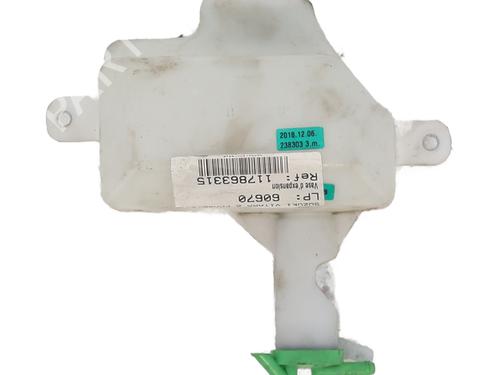 The expansion tank is a plastic container, consisting of two inlets, one for a fluid and the other for a gas. Its main function is to compensate for the increase in water volume caused by the rise in temperature. It is a device that is added by a closed loop system. This component is located in the engine compartment above the radiator.