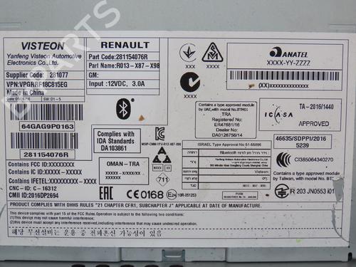 Radio RENAULT CLIO IV (BH_) 1.5 dCi 75 is a unique original used part with the reference 281154076R and with the article's id BP30522729E6