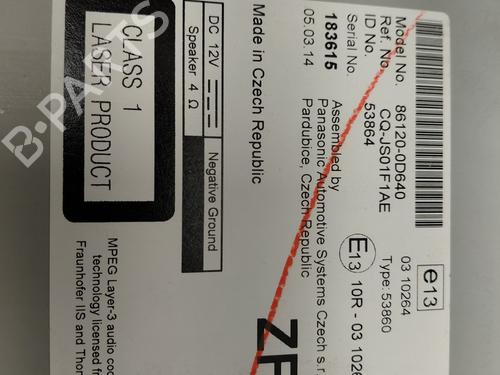 Radio TOYOTA YARIS (_P13_) 1.0 (KSP130_, KSP130) is a unique original used part with the reference 861200D640 and with the article's id BP31716714E6