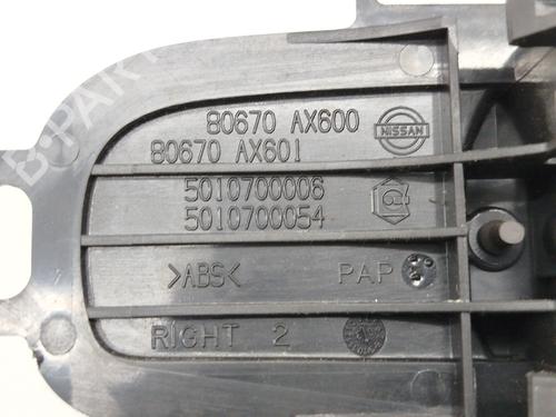 Front right interior door handle NISSAN MICRA III (K12) 1.0 16V (K12) is a unique original used part with the reference 80670AX600 and with the article's id BP31254443I14